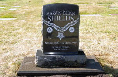 Members of the Seabee Veterans of America, Northwest District pay their respects as they place a floral remembrance on CM3 Marvin G. Shields grave marker. |